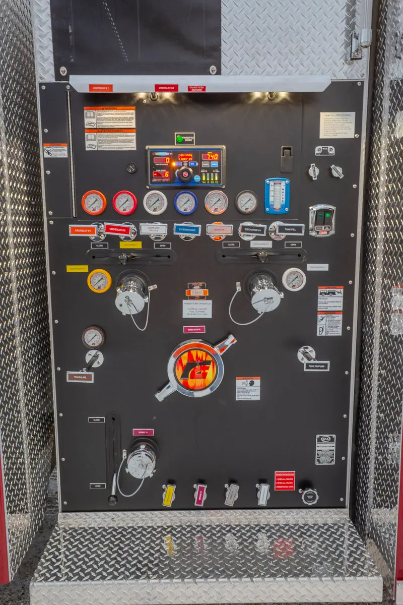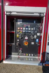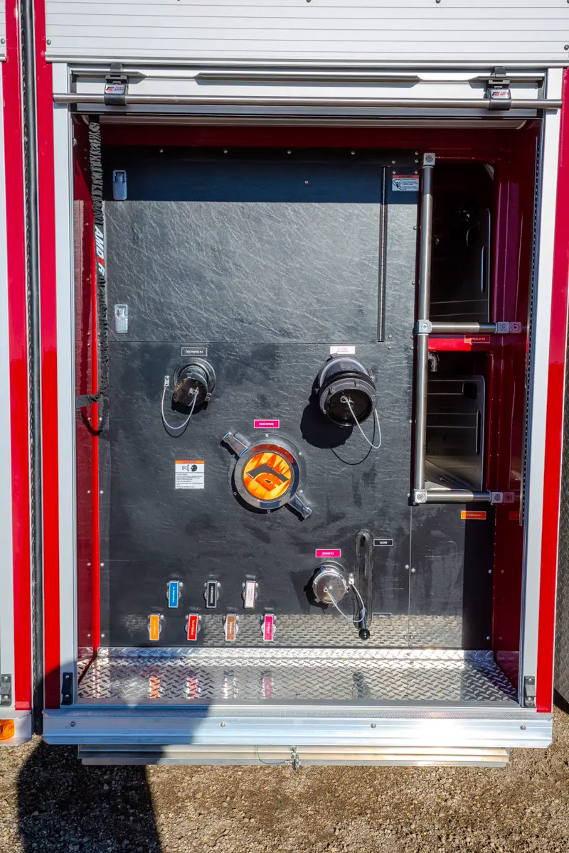 - Enclosed pump panel, discharges, and speedlays protected behind aluminum roll-up compartment doors